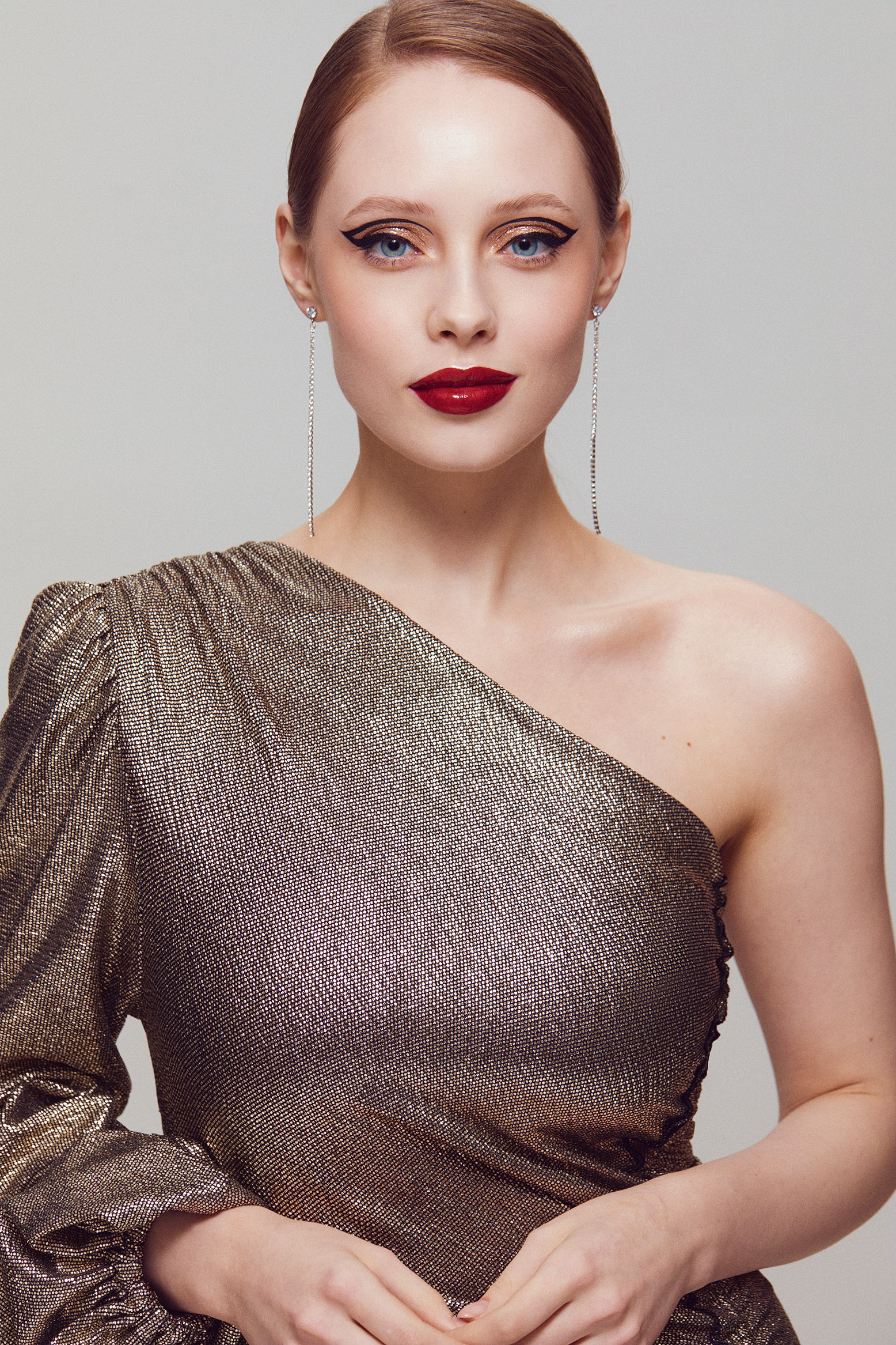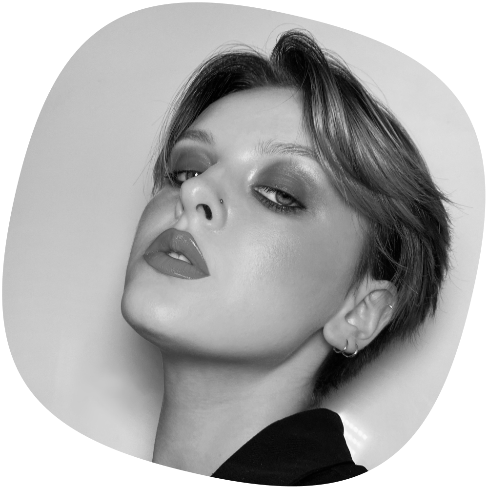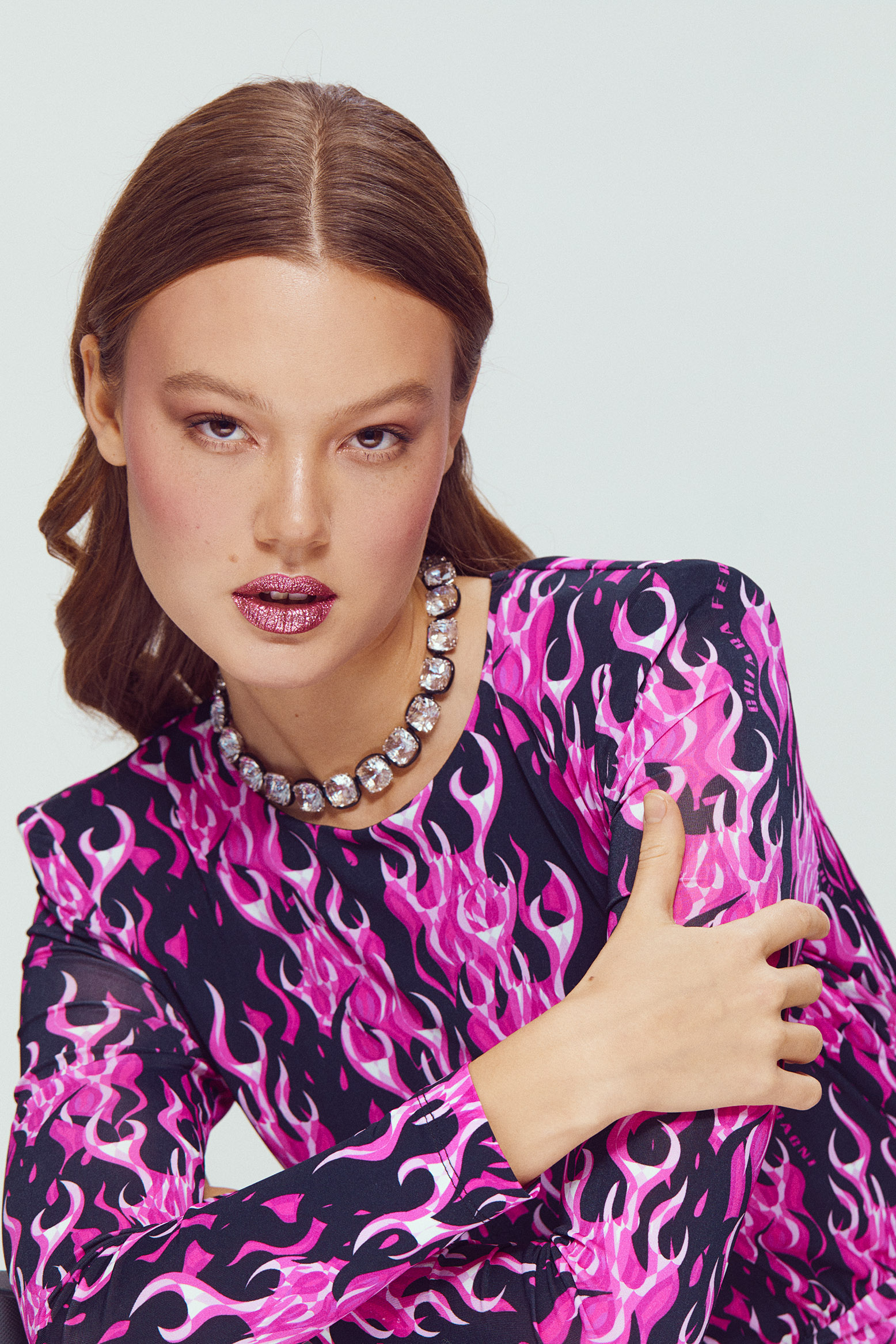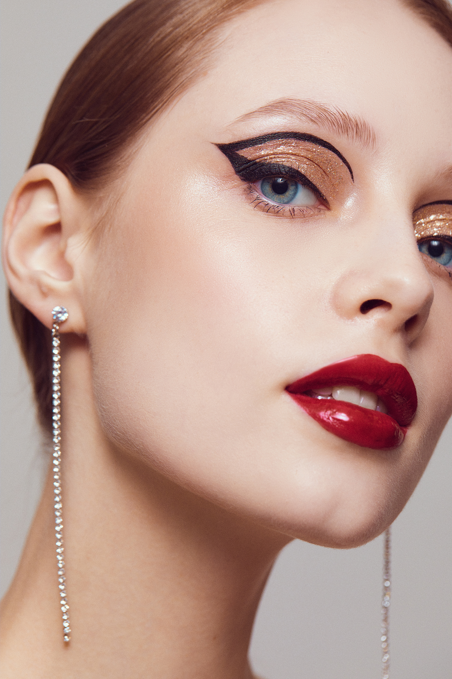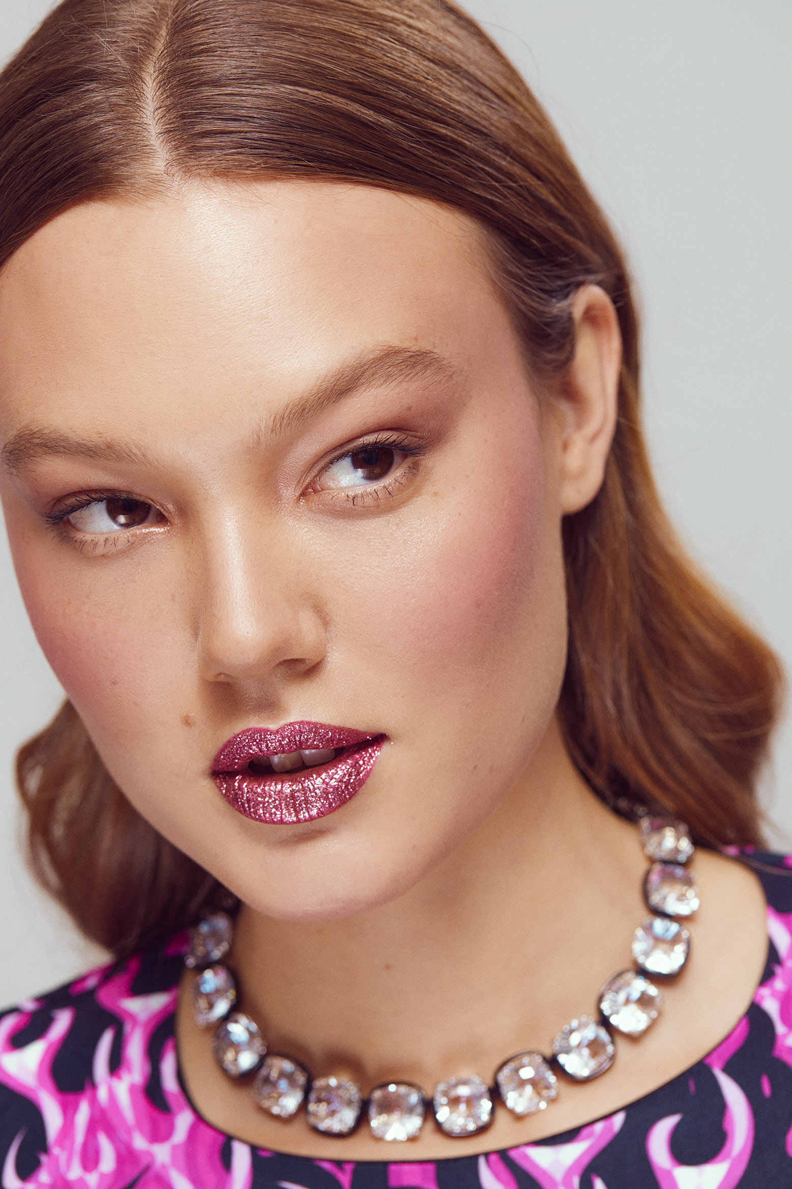 Для мерцающего макияжа губ возьмите трендовый розовый. Нанесите пигмент на яблочки щек пальцами, спонжем или кистью. Растушуйте румяна к вискам, добавьте немного средства на боковые поверхности лба и веки.