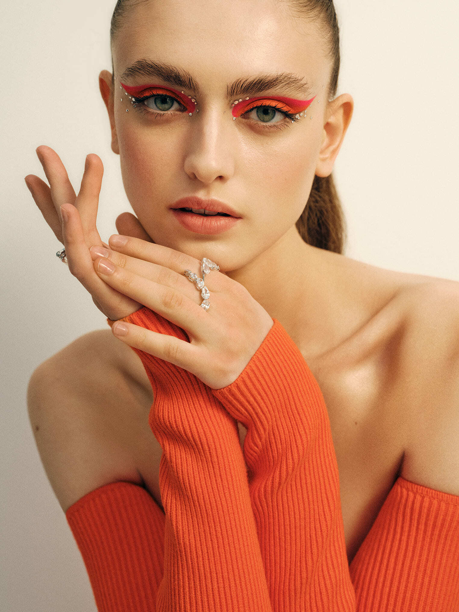 Летом много поводов для бьюти-экспериментов: выпускной, свадьба подруги, фестивали и вечеринки. Смелый образ с графичными цветными стрелками в сочетании ярко-розового и оранжевого не для робких, зато точно не останется без внимания. Добавьте немного страз или блесток в уголки глаз — такое даже Met Gala не снилось!