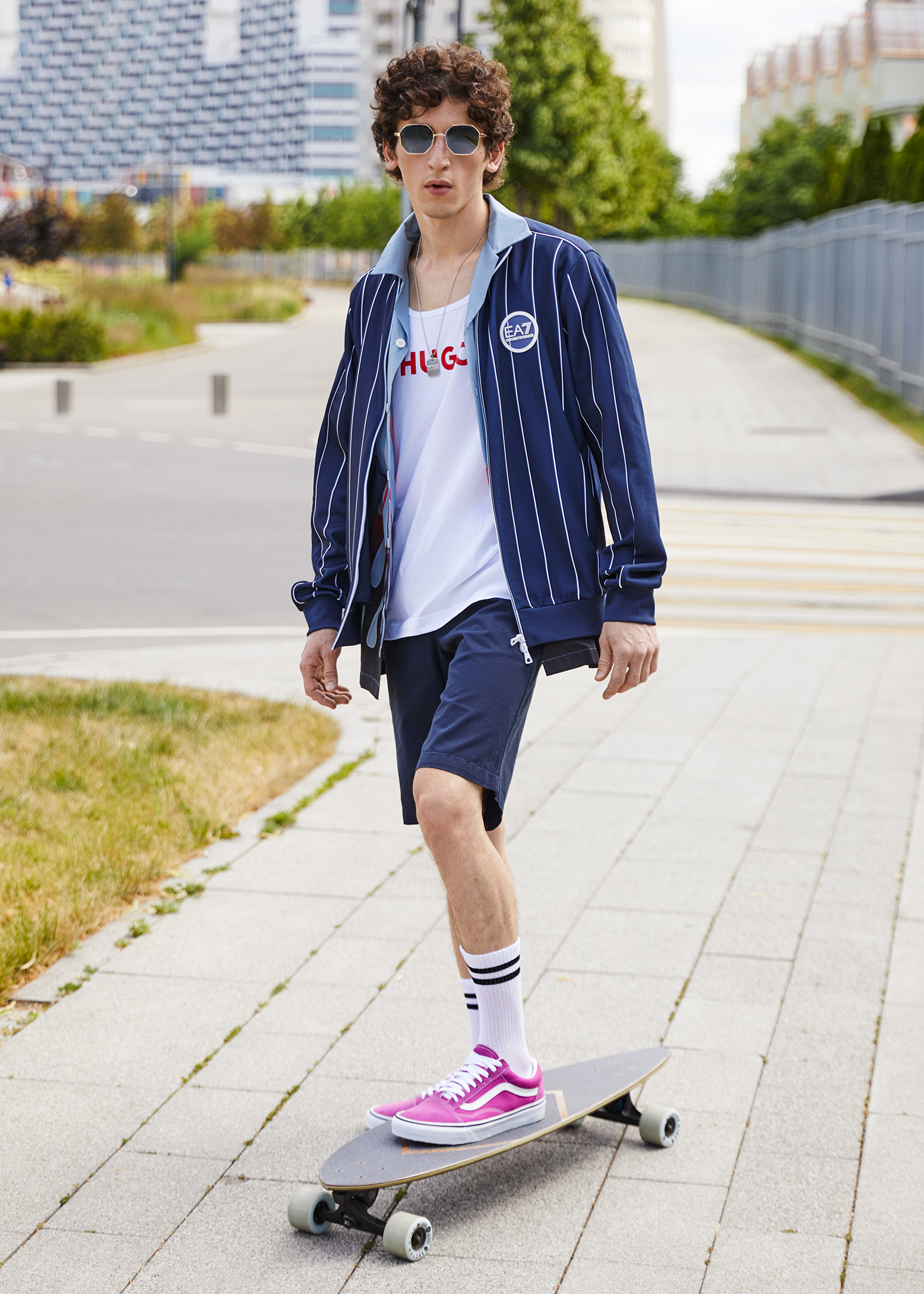 кеды Vans выходят на первый план — без них подобную эстетику сложно представить законченной. Модель Old Skool из замши и текстиля дополнена усиленными мысками, поддерживающими мягкими вставками в области щиколоток и фирменной резиновой подошвой, которая идеально подходит для гладкой поверхности доски. А еще эта версия была выпущена аж в 1977 году и называлась раньше Vans №36. Она стала первой моделью с фирменной боковой полосой, которую придумал основатель бренда Пол Ван Дорен.