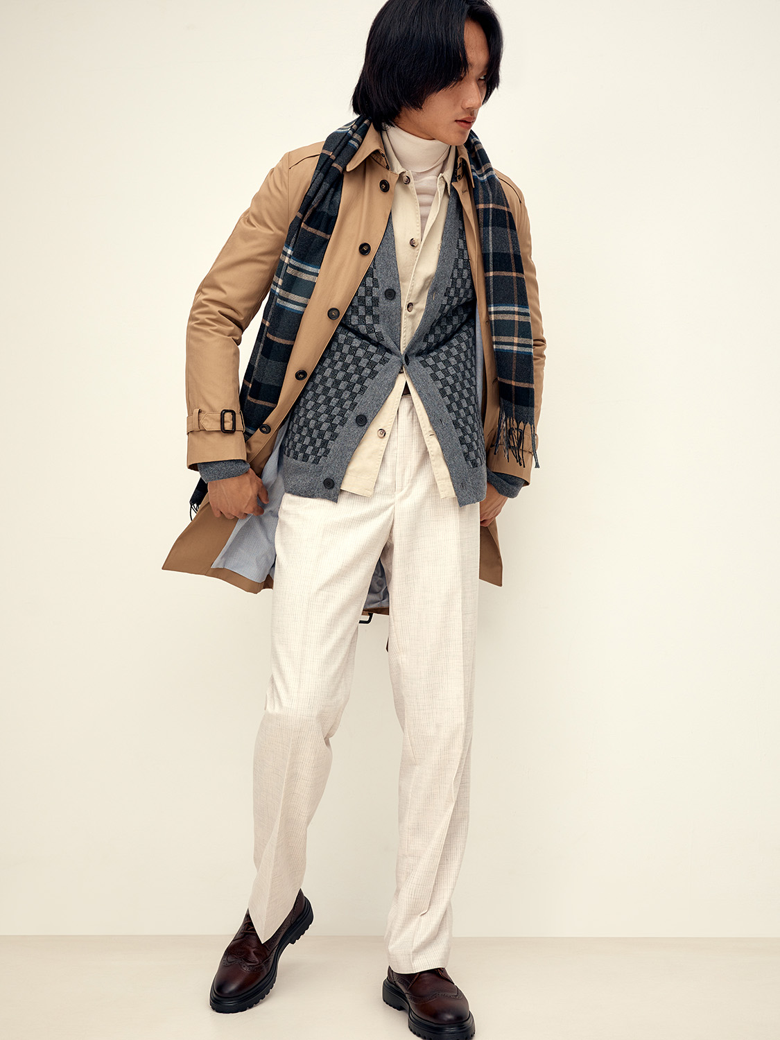 Не забудьте добавить яркий акцент, например, шарф с узором тартан или берет — оба сейчас в моде.
